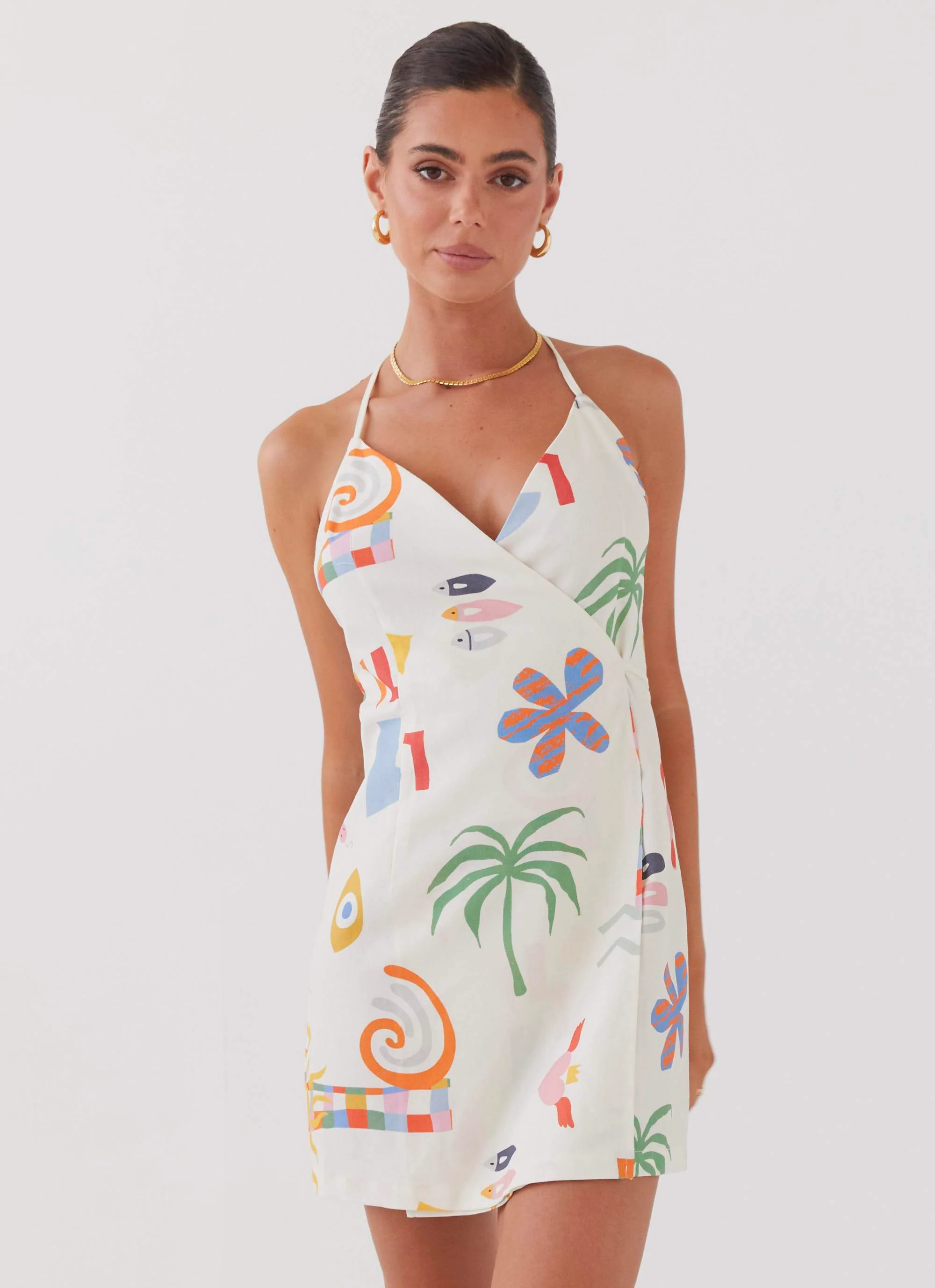 At Last Sunrise Wrap Linen Mini Dress - Summer Palm