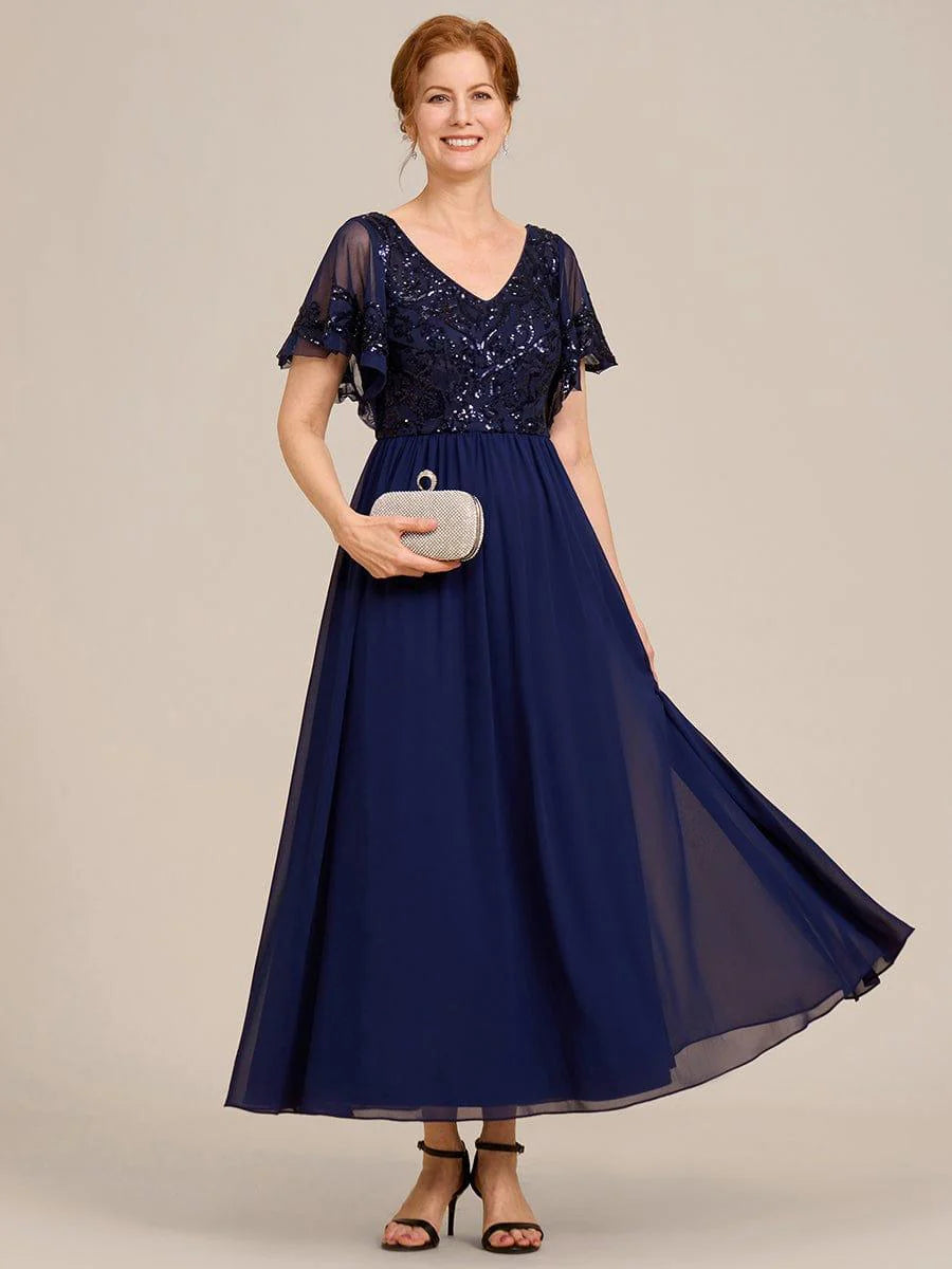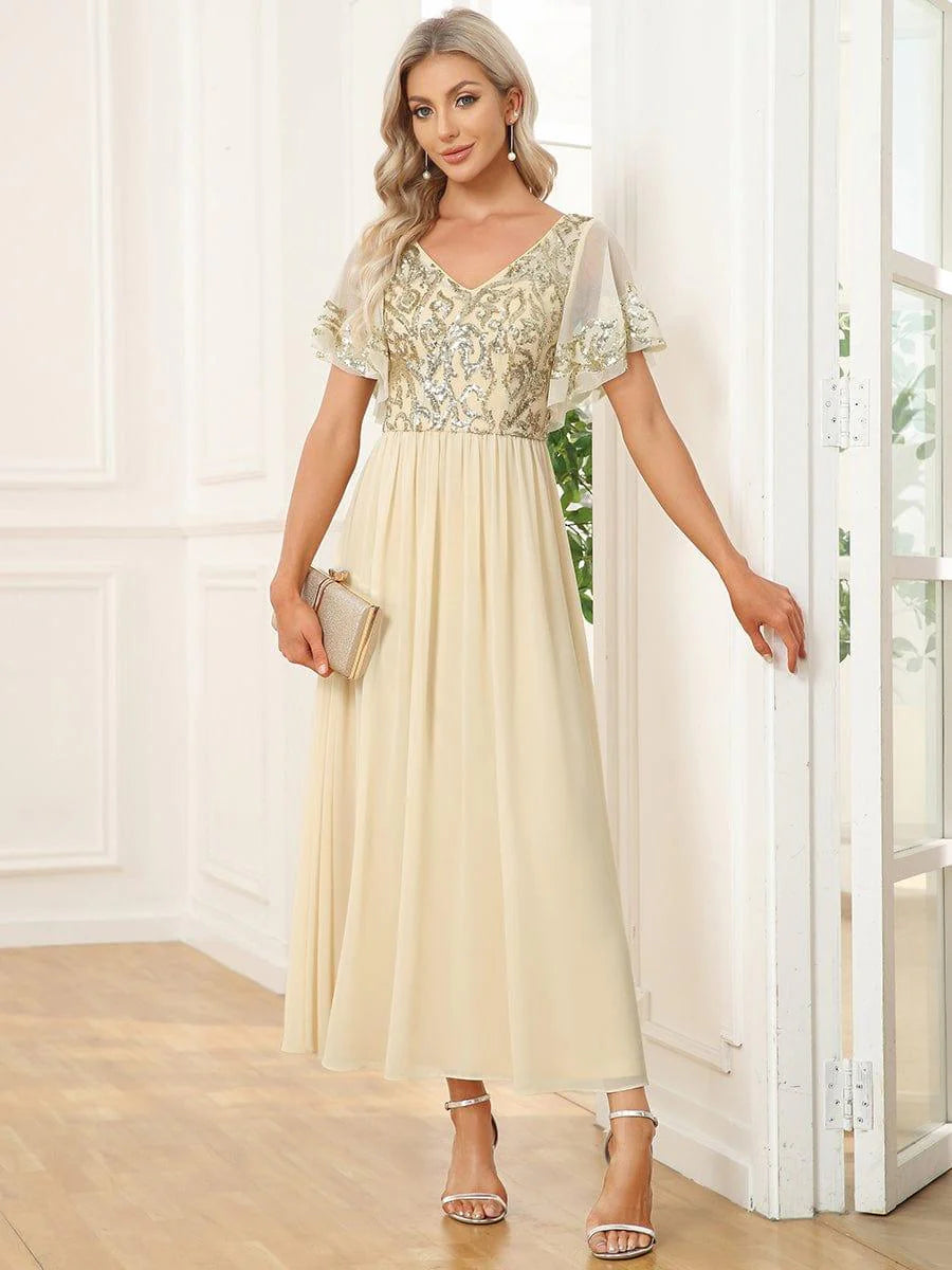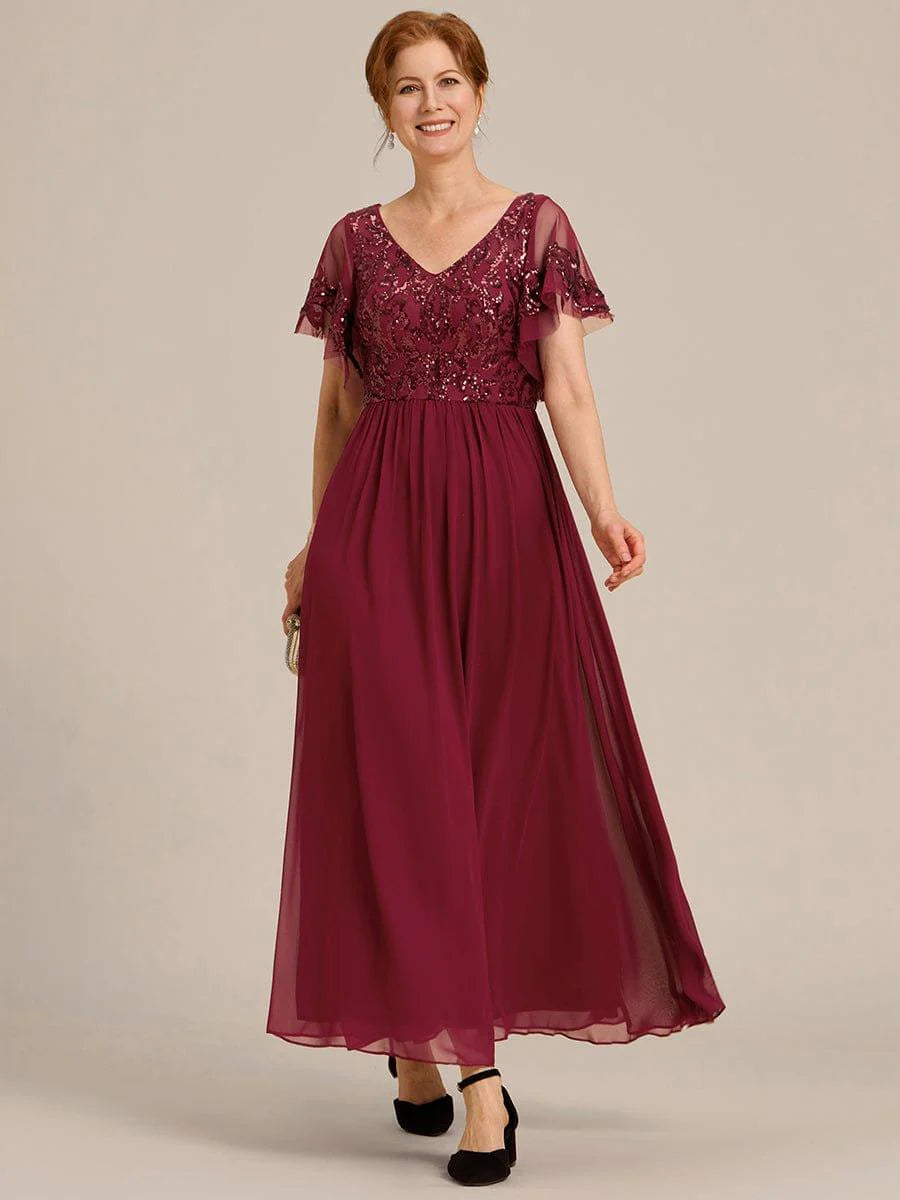 This vintage-influenced mother of the bride dress features a classic A-line silhouette. A cinched waist complements the gorgeous sequin pattern on the top with sheer, draped sleeves and a plunging v-neck and v-back. An ankle-length tulle bottom finishes the look, giving it effortless elegance.