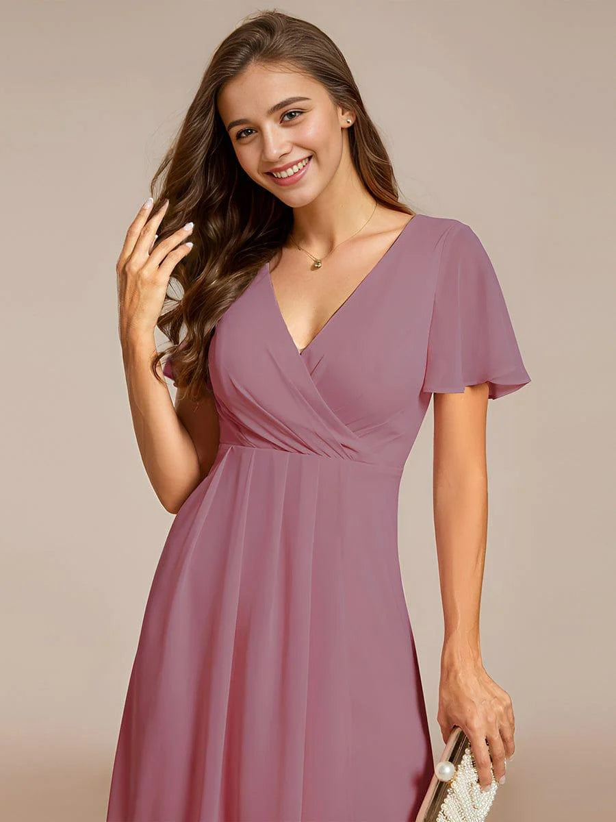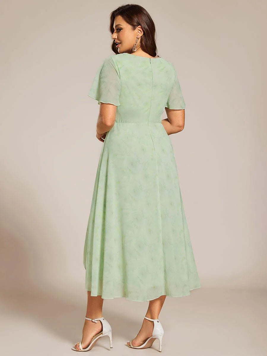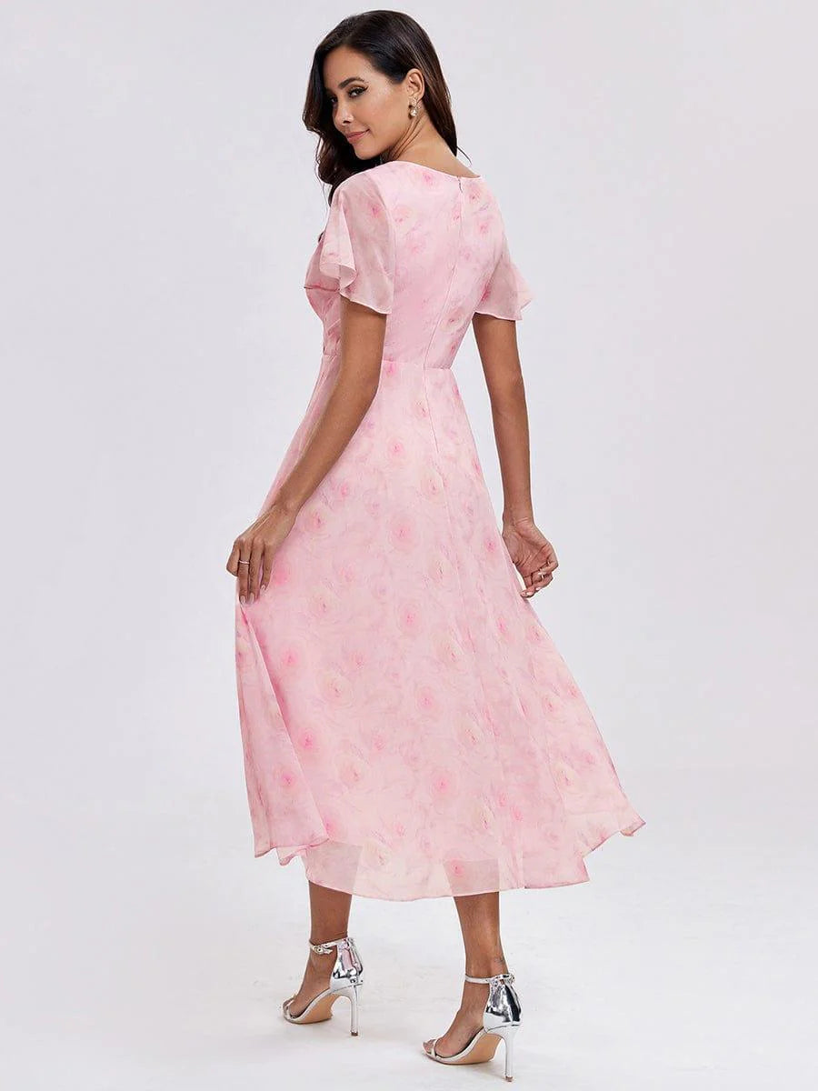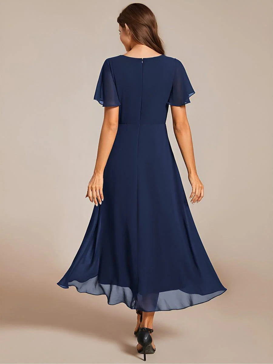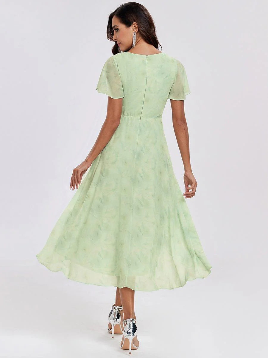 Elevate your evening look with this chiffon midi dress. The pleated bodice flatters your figure, while the delicate ruffled sleeves add a romantic touch. Designed with comfort and grace in mind, its flowing A-line silhouette ensures ease of movement. Perfect for weddings, cocktail parties, or any special occasion.