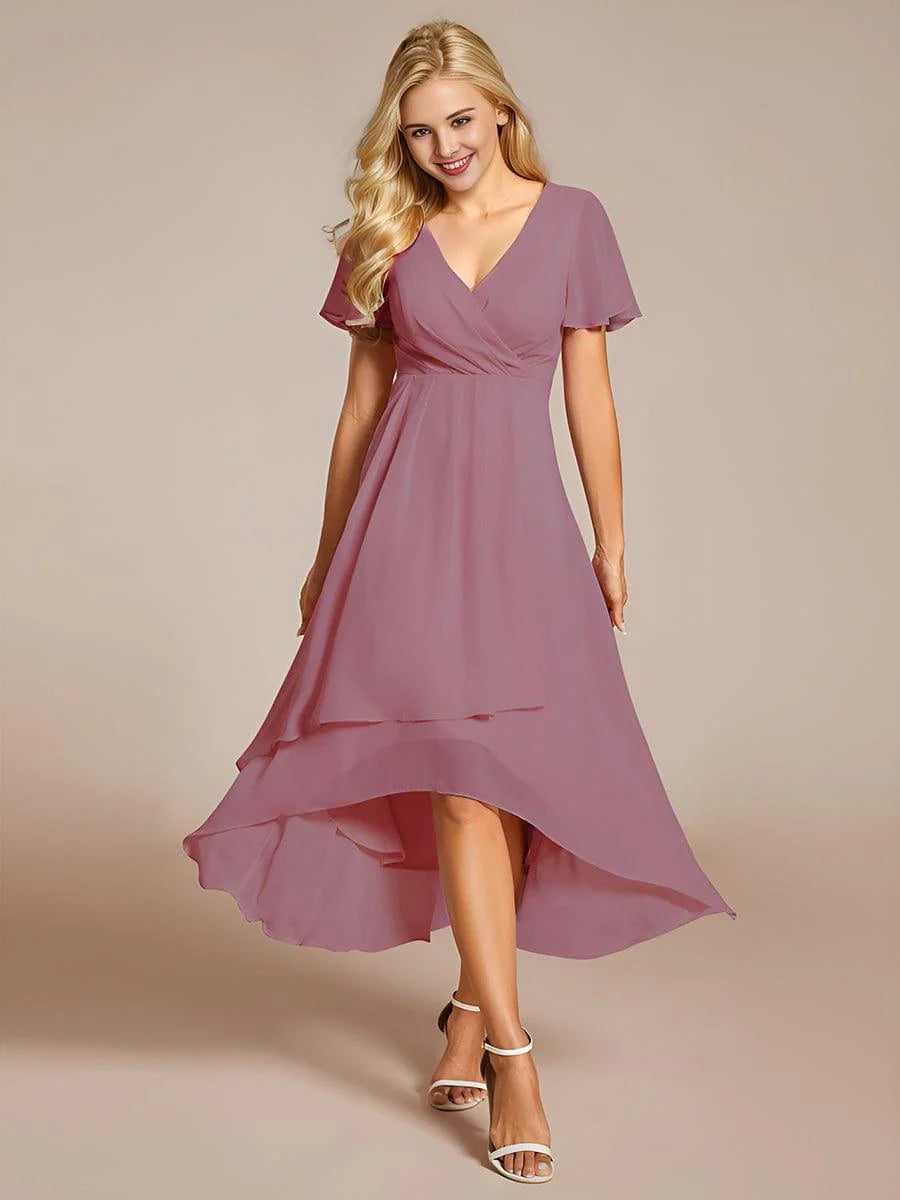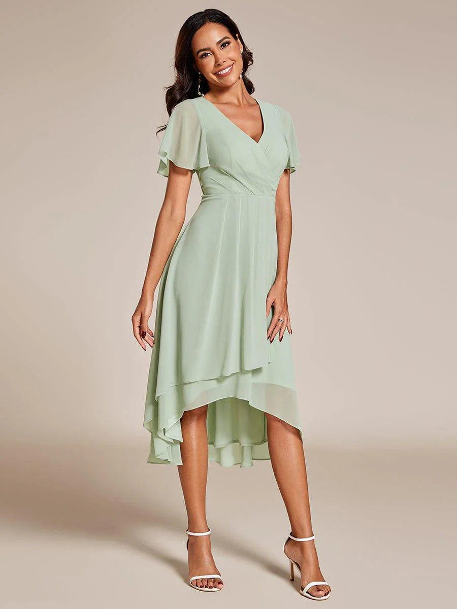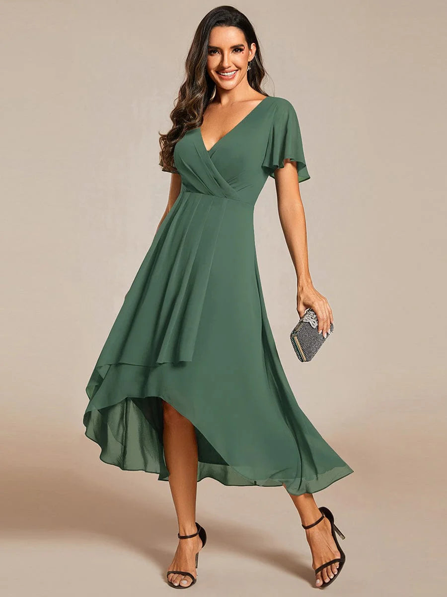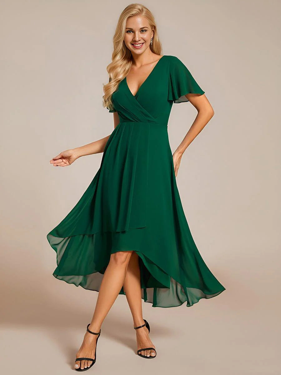 Elevate your evening look with this chiffon midi dress. The pleated bodice flatters your figure, while the delicate ruffled sleeves add a romantic touch. Designed with comfort and grace in mind, its flowing A-line silhouette ensures ease of movement. Perfect for weddings, cocktail parties, or any special occasion.