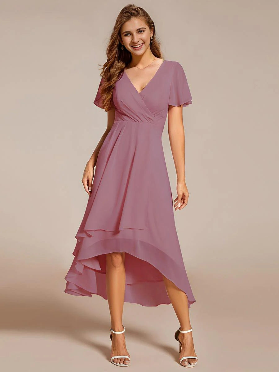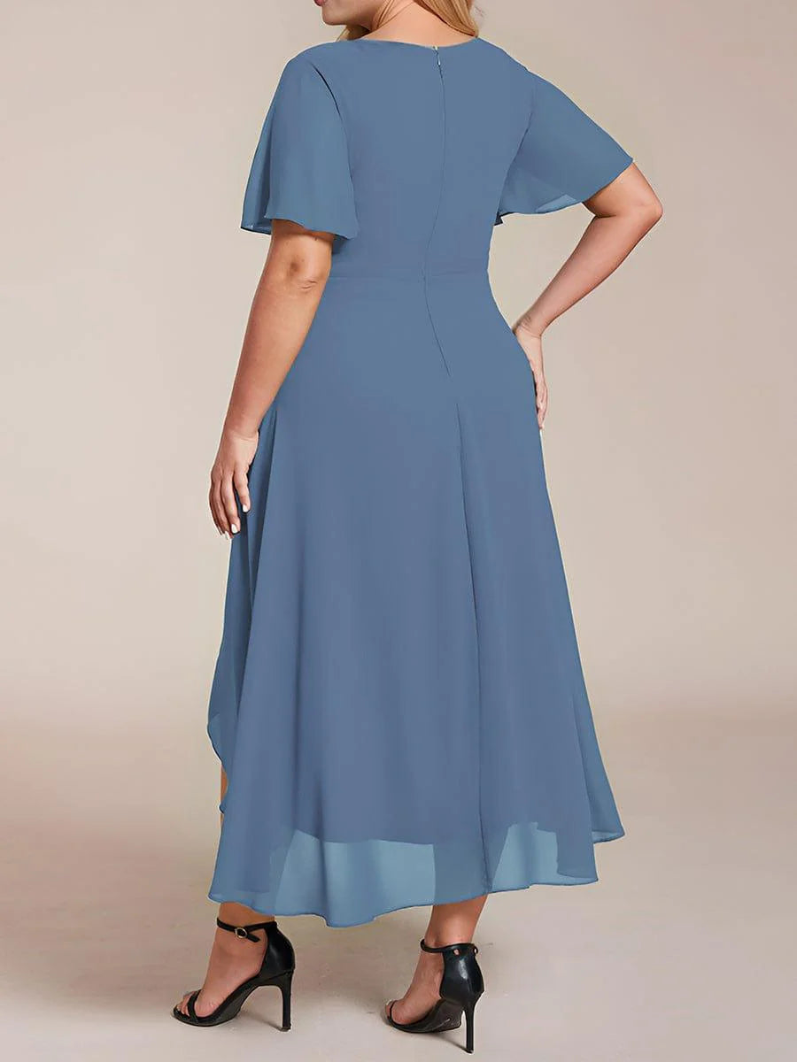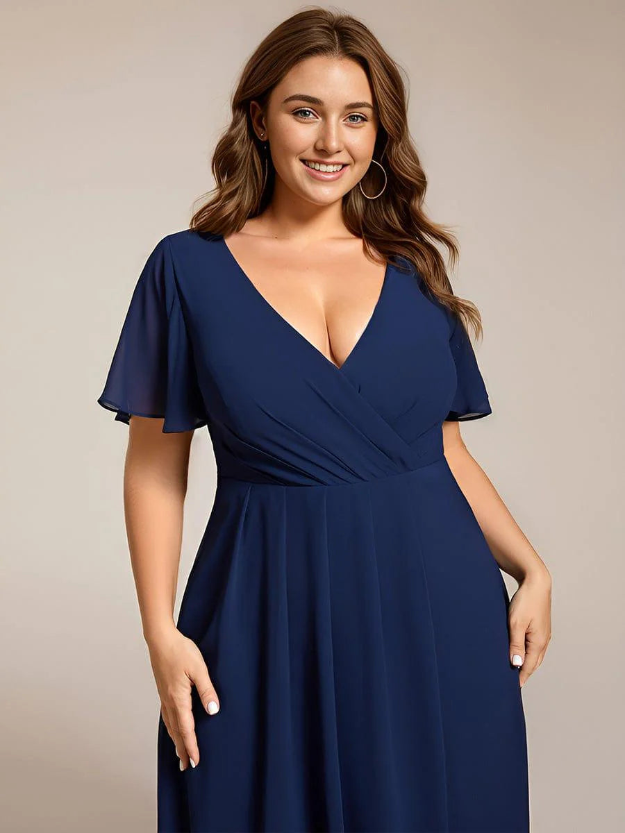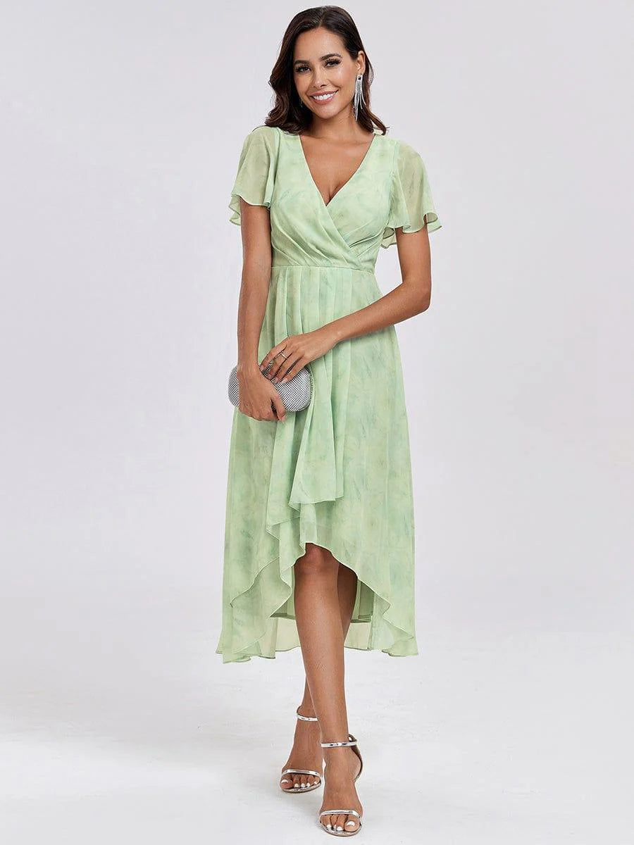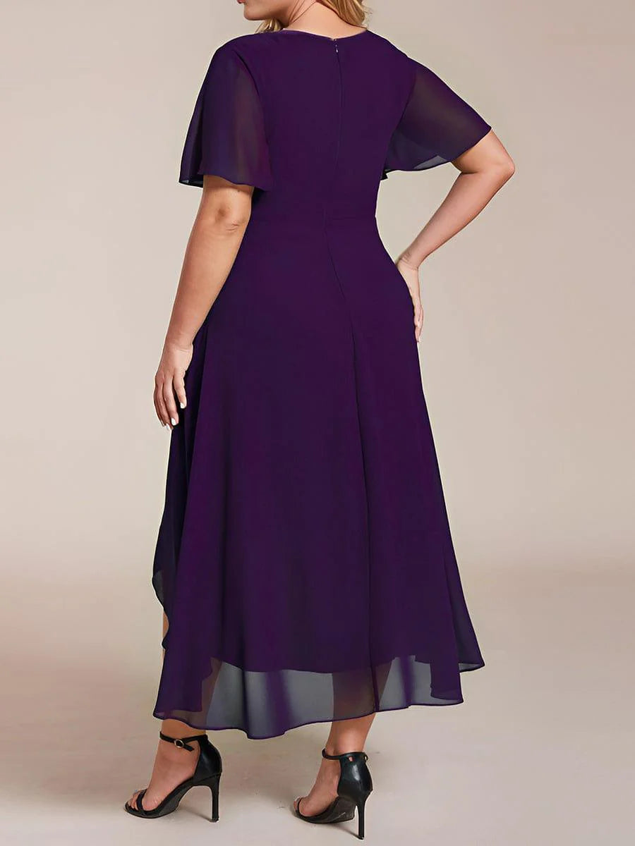 Elevate your evening look with this chiffon midi dress. The pleated bodice flatters your figure, while the delicate ruffled sleeves add a romantic touch. Designed with comfort and grace in mind, its flowing A-line silhouette ensures ease of movement. Perfect for weddings, cocktail parties, or any special occasion.