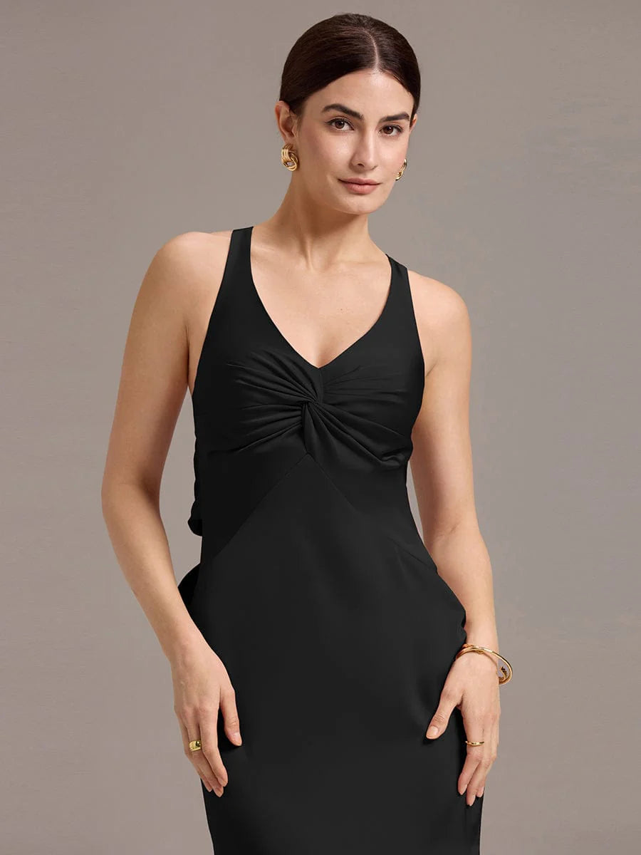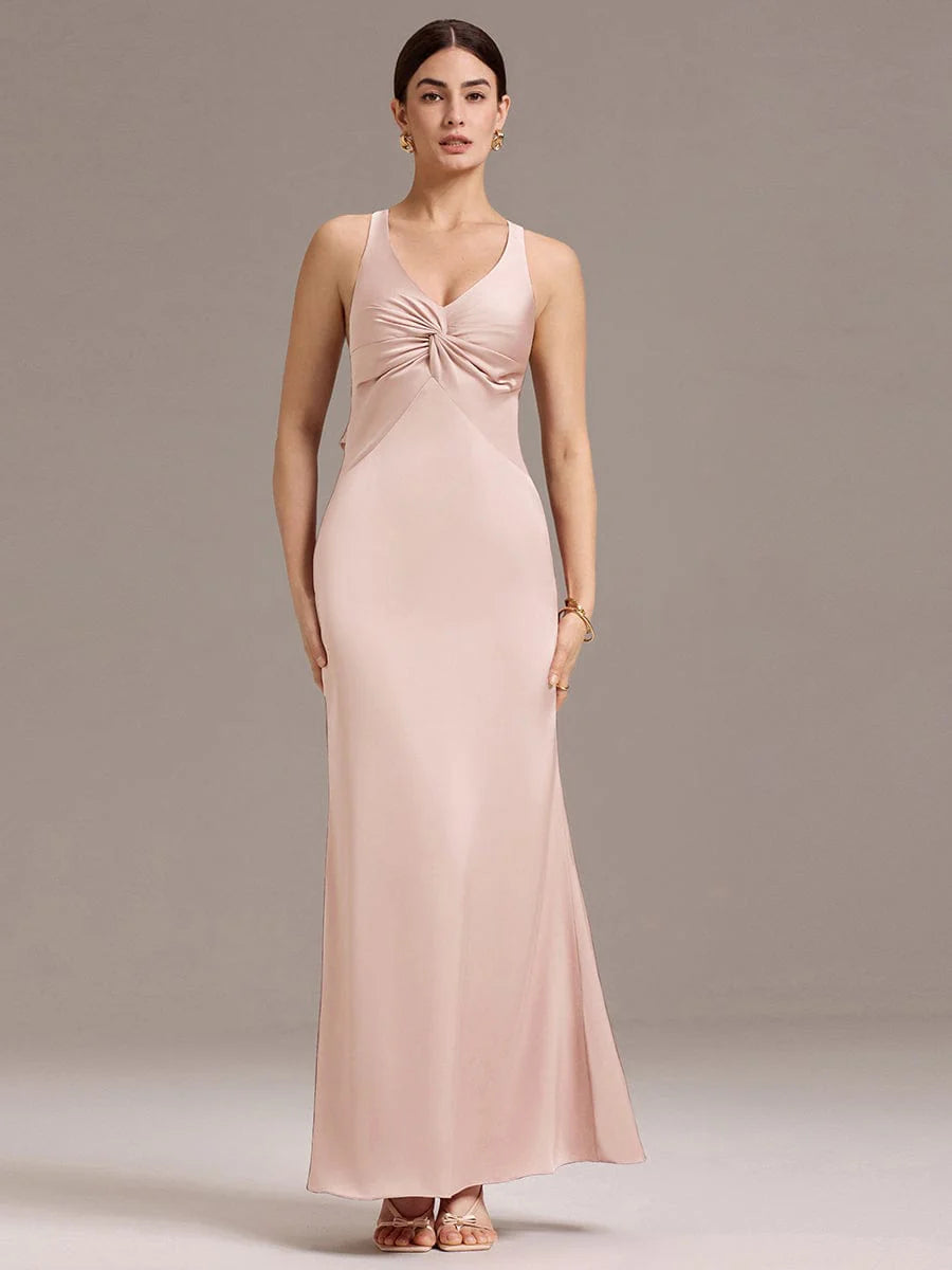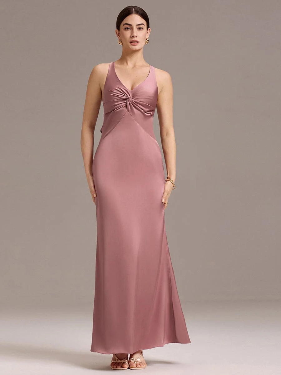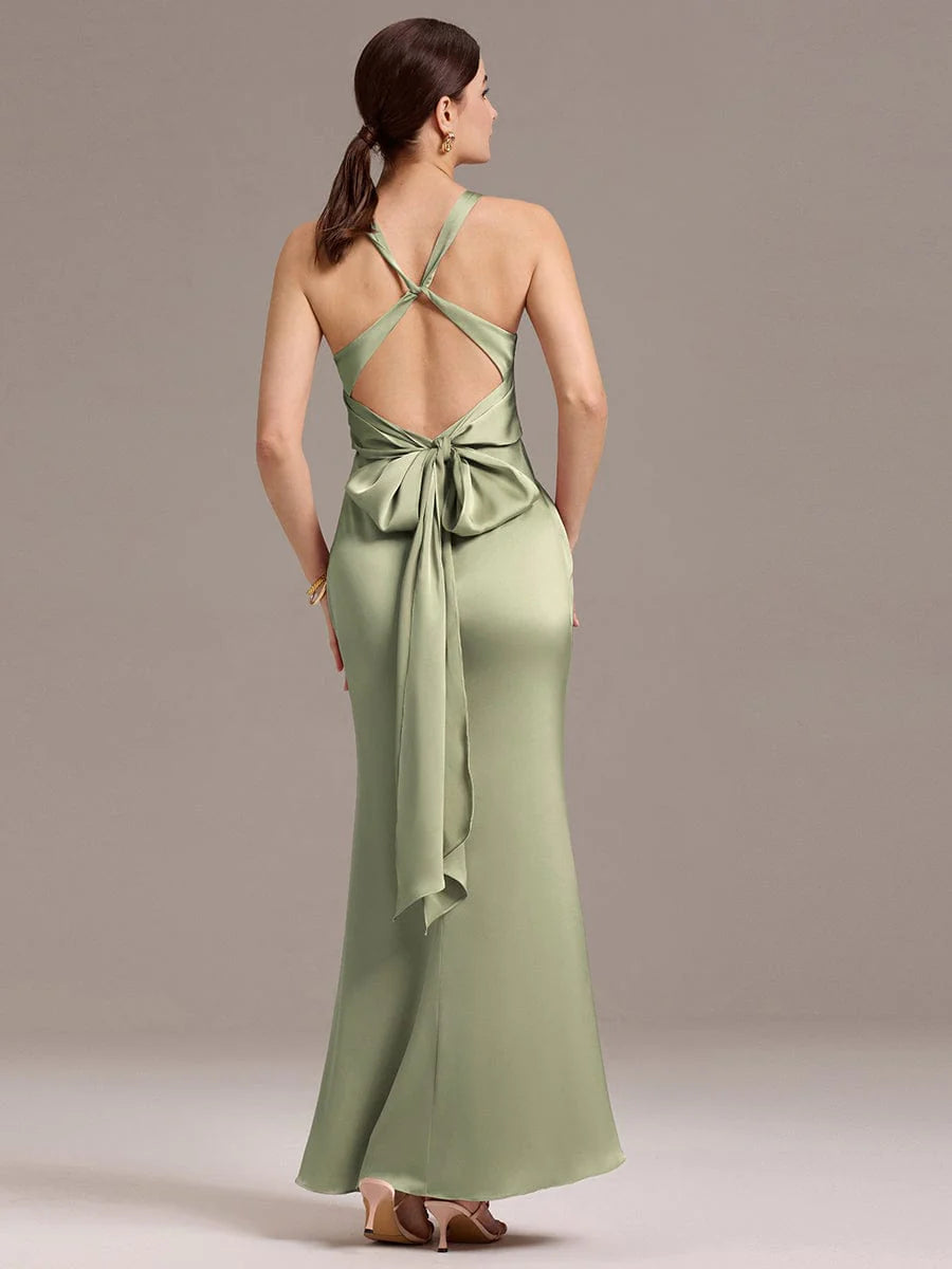 Make a stunning statement in this satin mermaid dress that hugs your curves beautifully. The elegant V-neck design complements the flattering fit, while the unique knot detail at the front adds a chic touch. The strappy back with a bow brings a playful yet sophisticated flair, perfect for bridesmaids seeking a blend of comfort and style. Suitable for weddings and formal events, this dress ensures you stand out while feeling glamorous.